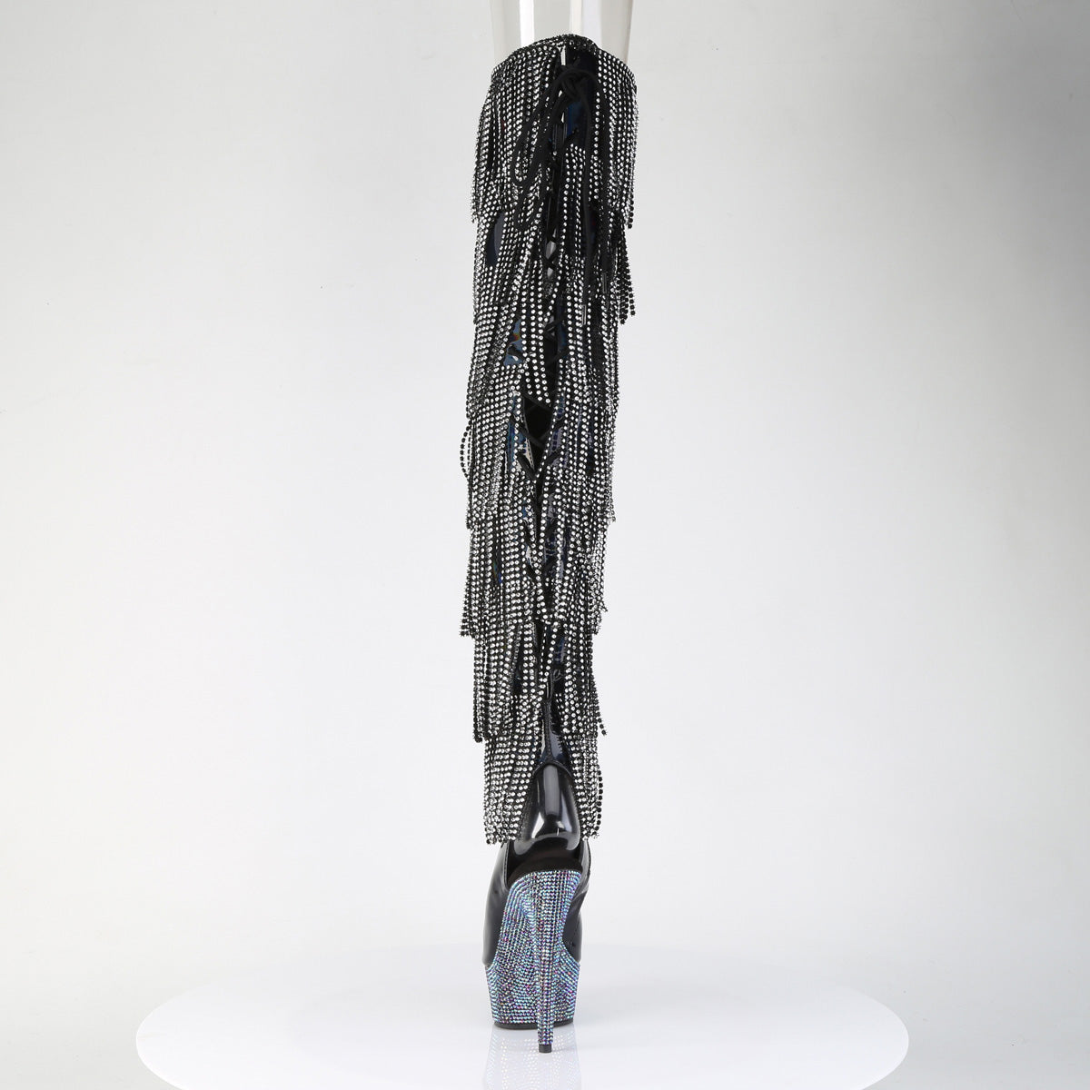 6" (152mm) Heel, 1 3/4" (45mm) Platform Open Heel/Toe Lace-Up Back Thigh High Boot Featuring 7-Layer Simulated Rhinestone Fringes and Silver AB Rhinestones Encrusted All-Over the Entire Platform Bottom, Full Length Inner Side Zip Closure